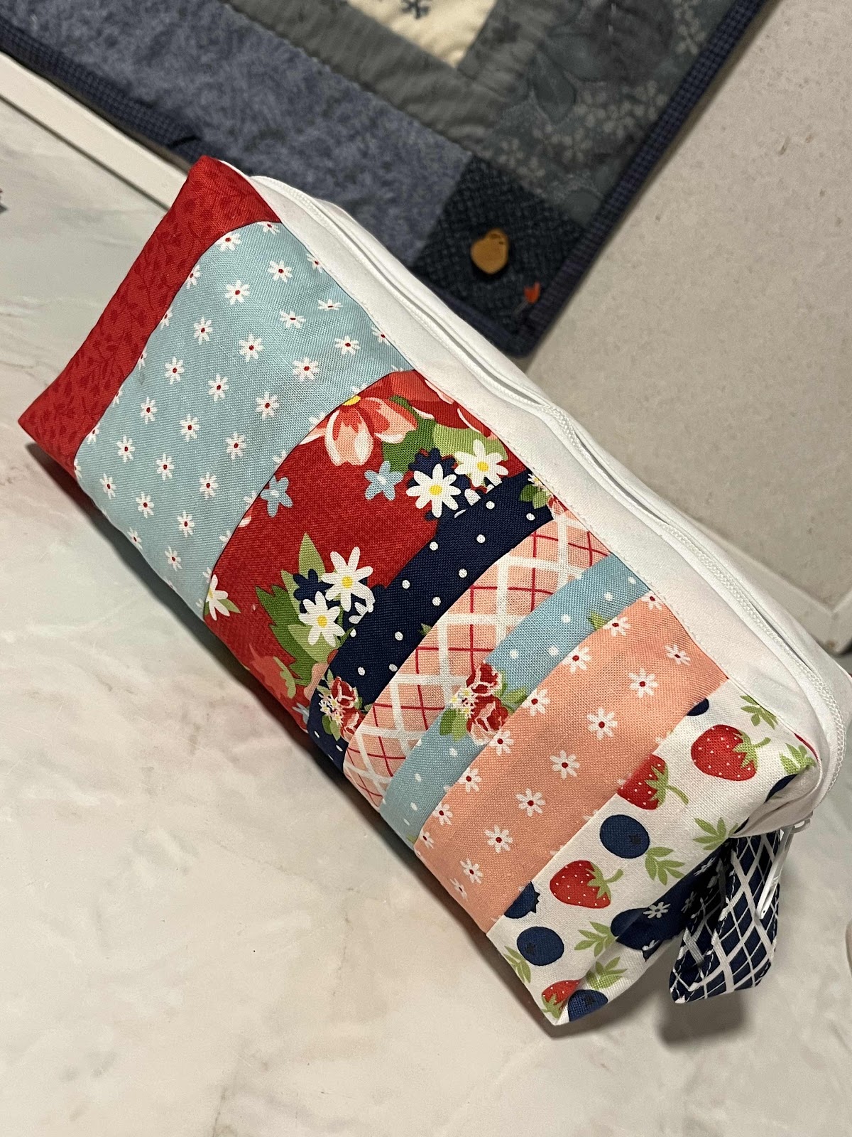 I managed to start and finish this zipper pouch from a kit the other evening. It basically took me all evening - from dinnertime to bedtime - but the endresults were kinda cute. This was a kit from a Sew Sampler Box (a subscription from Fat Quarter Shop), and included stabilisers with printed pattern, fabric, zipper and sewing instructions. I learned a little from other people who've made the same pouch (my mom included) and decided to skip the stabilisers on the lining fabric, thus making it a little bit softer, and quite a bit fewer layers of fabric to sew through at the end.